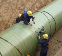 由計(jì)算機(jī)控制,在芯模上按規(guī)定的與纖維纏繞玻璃鋼管相同的工藝制造內(nèi)襯,凝膠后按設(shè)計(jì)好的線型和厚度纏繞結(jié)構(gòu)層,并將石英砂與樹脂混合的砂漿纏在結(jié)構(gòu)層中,再纏繞外保護(hù)層。