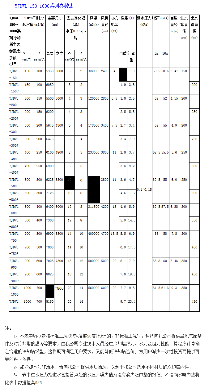 標(biāo)記示例:YJDWL-500表示機(jī)力通風(fēng)普通型無填料噴霧冷卻塔,鋼結(jié)構(gòu)框架、方形、無水盤、流量500m3/h。