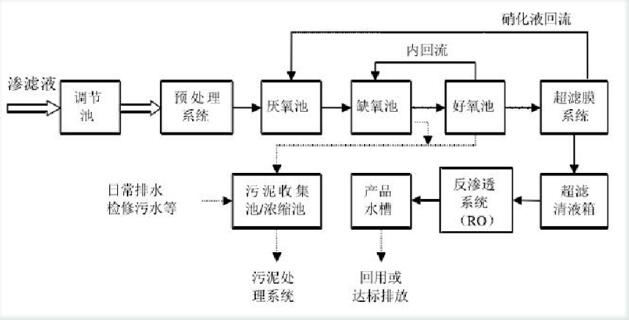 通過以上對垃圾滲濾液的各污染物分析及其水質(zhì)水量受當?shù)貧夂蚝屠盥駡觥澳挲g”的影響,對處理方法一一進行說明和比較,結(jié)合生活垃圾滲濾液的具體情況以及污水處理的目的、投資、占地面積、能耗、運行費用、管理方面程度、運行可靠性及使用壽命等綜合因素的分析,以及我公司根據(jù)大量前期調(diào)研結(jié)果、吸收國內(nèi)外滲濾液處理的經(jīng)驗并結(jié)合多年廢水治理的實踐經(jīng)驗,在進行充分、合理分析污水處理系統(tǒng)運行過程中將會出現(xiàn)的水質(zhì)沖擊負荷及當?shù)氐木唧w氣候等情況后,特采用以下工藝: