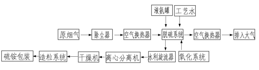 氨一硫酸按法脫硫工藝是用氨吸收劑吸收煙氣中的二氧化硫, 在吸收過程中,氨吸收液吸收SO2并生成亞硫酸銨與亞硫酸氫銨,經(jīng)壓縮空氣氧化生成硫酸銨, 再經(jīng)加熱蒸發(fā)結(jié)晶析出硫酸銨, 過濾干燥后得產(chǎn)品。