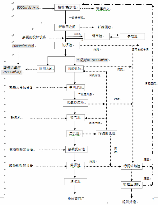 各車間、工段生產(chǎn)廢水經(jīng)初次撈漿后,輸送至格柵渠,在此撈除大塊的浮渣后進(jìn)入集水池。廢水經(jīng)集水池內(nèi)的提升泵提升到纖維回收間進(jìn)一步去除懸浮物、實(shí)現(xiàn)漿回收,同時(shí)為后續(xù)的生化處理系統(tǒng)創(chuàng)造條件。廢水經(jīng)過纖維回收設(shè)備后自流到初沉池,去除水中的絕大部分懸浮物,以確;赜盟幕赜盟|(zhì),在初沉池后廢水回用至生產(chǎn)車間,同時(shí)白水也直接回用;其余的的廢水進(jìn)入下一個(gè)污水處理工段;